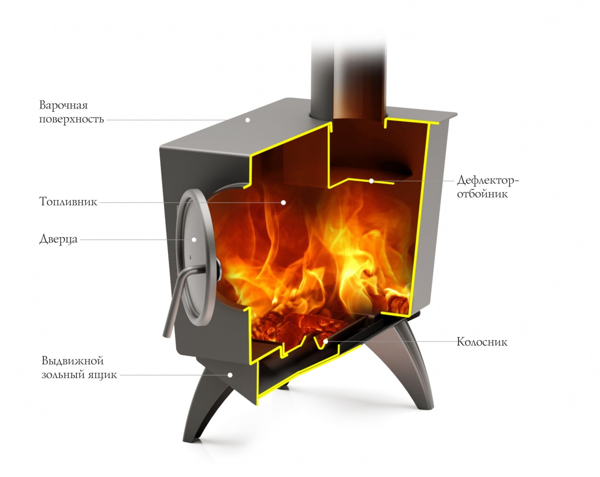 Она предназначена для дровяного воздушного отопления небольших жилых помещений, гаражей, палаток, подвалов, кунгов, а также для разогрева пищи.